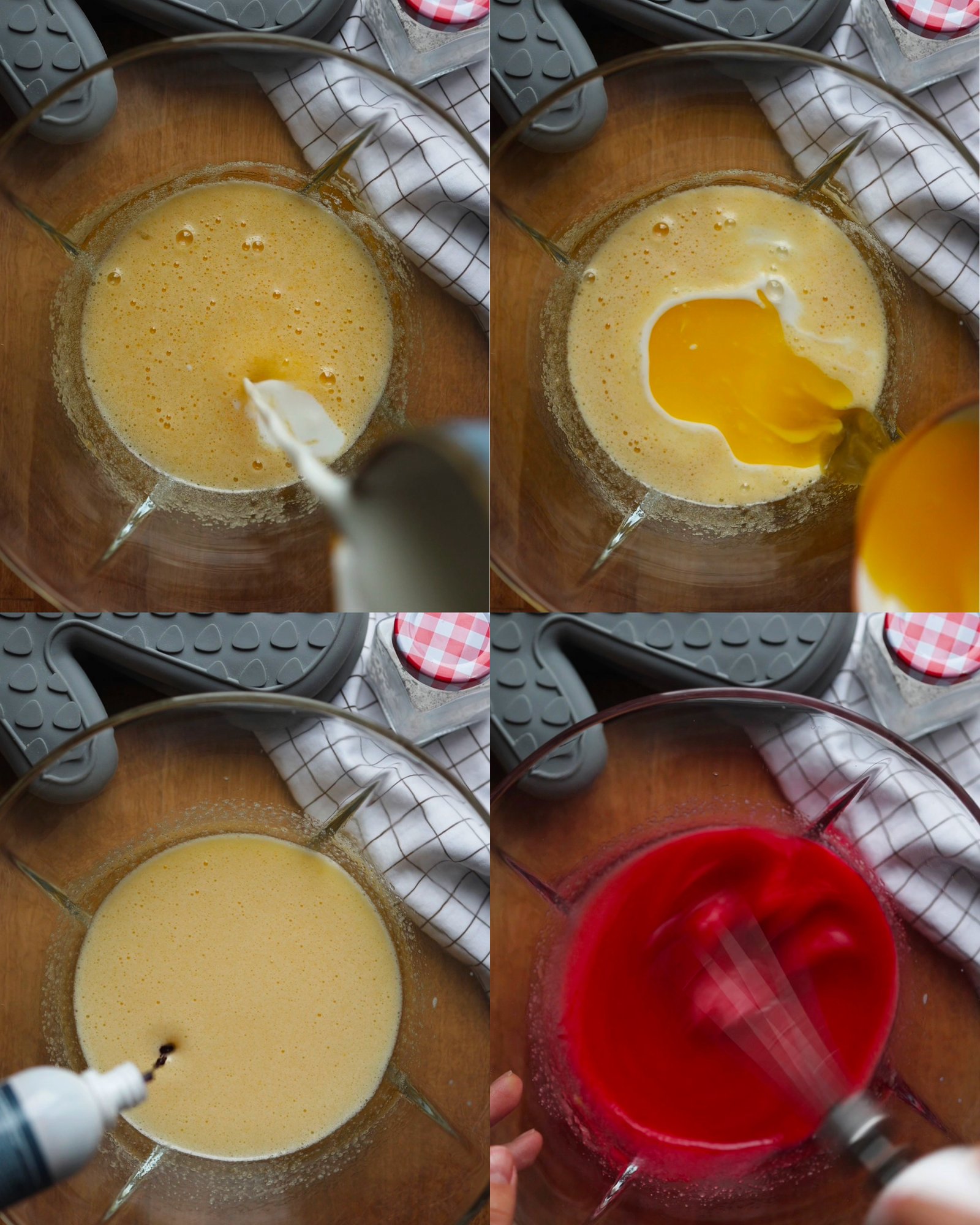 Pour in the milk and melted (but not hot) butter. The butter should be warm but comfortable to the touch — if it’s too hot, it can cook the egg. Whisk again until the mixture is fully combined and smooth. If using food coloring, add it now and mix thoroughly so the color distributes evenly throughout the dough.